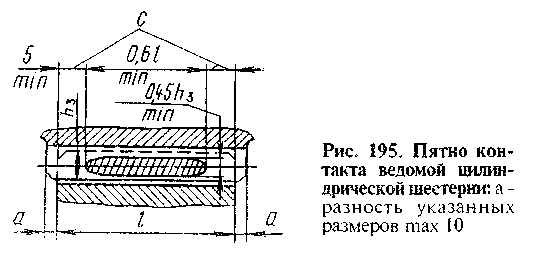 Пятно контакта на обеих сторонах зуба ведомой конической шестерни должно иметь длину, равную приблизительно 1/2...2/3 длины зуба на стороне переднего хода, 1/2...3/4 длины зуба со стороны заднего хода. Минимальная ширина пятна контакта в средней части должна быть равна 1/2 активной высоты зуба. Контакт должен быть расположен ближе к внутренней части зуба, но не должен выходить на его кромку. Выход пятна контакта на кромку внешней (широкой) части также недопустим. На зубьях ведущей шестерни пятно контакта может доходить до верхней кромки. Пятно контакта получают путем вращения ведущей шестерни в обе стороны при одновременном подтормажнванни рукой ведомой шестерни.