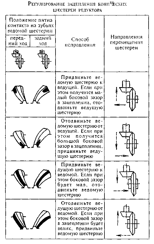 При установке новых конических шестерен редуктора отрегулируйте их по пятну контакта и боковому зазору в зацеплении (табл.33), который должен быть 0, 20...0,35 мм.