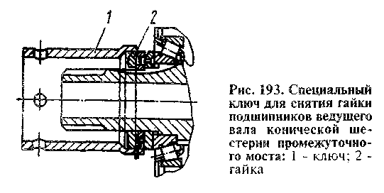 Разборка ведущей конической шестерни (рис. 192). Расстопорите и отверните гайку 2 специальным ключом, который служит переходником под рожковый ключ размером 46 мм (рис. 193), снимите замковую шайбу 1 (см. рис. 192), шайбу 3 подшипника. Отверните гайку 4 подшипника в сборе со стопорным штифтом 5. Снимите стакан 7 в сборе с подшипником 6, регулировочные шайбы 8, распорную втулку 9. Спрессуйте съемником внутреннее кольцо конического роликоподшипника 10 с ведущей конической шестерни 11. Снятие производите аналогично снятию внутреннего кольца подшипника с ведущей конической шестерни главной передачи заднего моста.