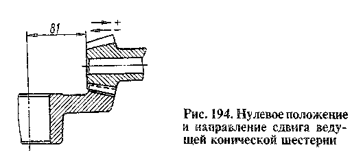 Ведущую и ведомую конические шестерни редуктора подбирают на заводе в комплекты по пятну контакта и боковому зазору в зацеплении, притирают и клеймят порядковым номером комплекта. Кроме того, на заднем торце ведущей конической шестерни наносится электрографом величина отклонения (поправка в сотых долях мм) от теоретического установочного размера 81 мм (рис. 194). Знак "+" соответствует удалению ведущей шестерни от оси ведомой, знак " - " - приближению.