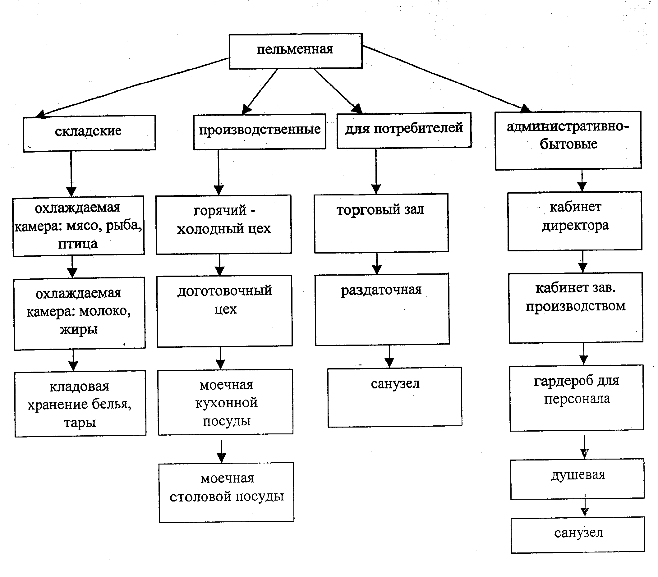 С учетом требований технологического проектирования в пельменной "Отменная" предусмотрены следующие группы помещений: складские, производственные, для потребителей, административно-бытовые. Структура помещений представлена на рис. 2.1.