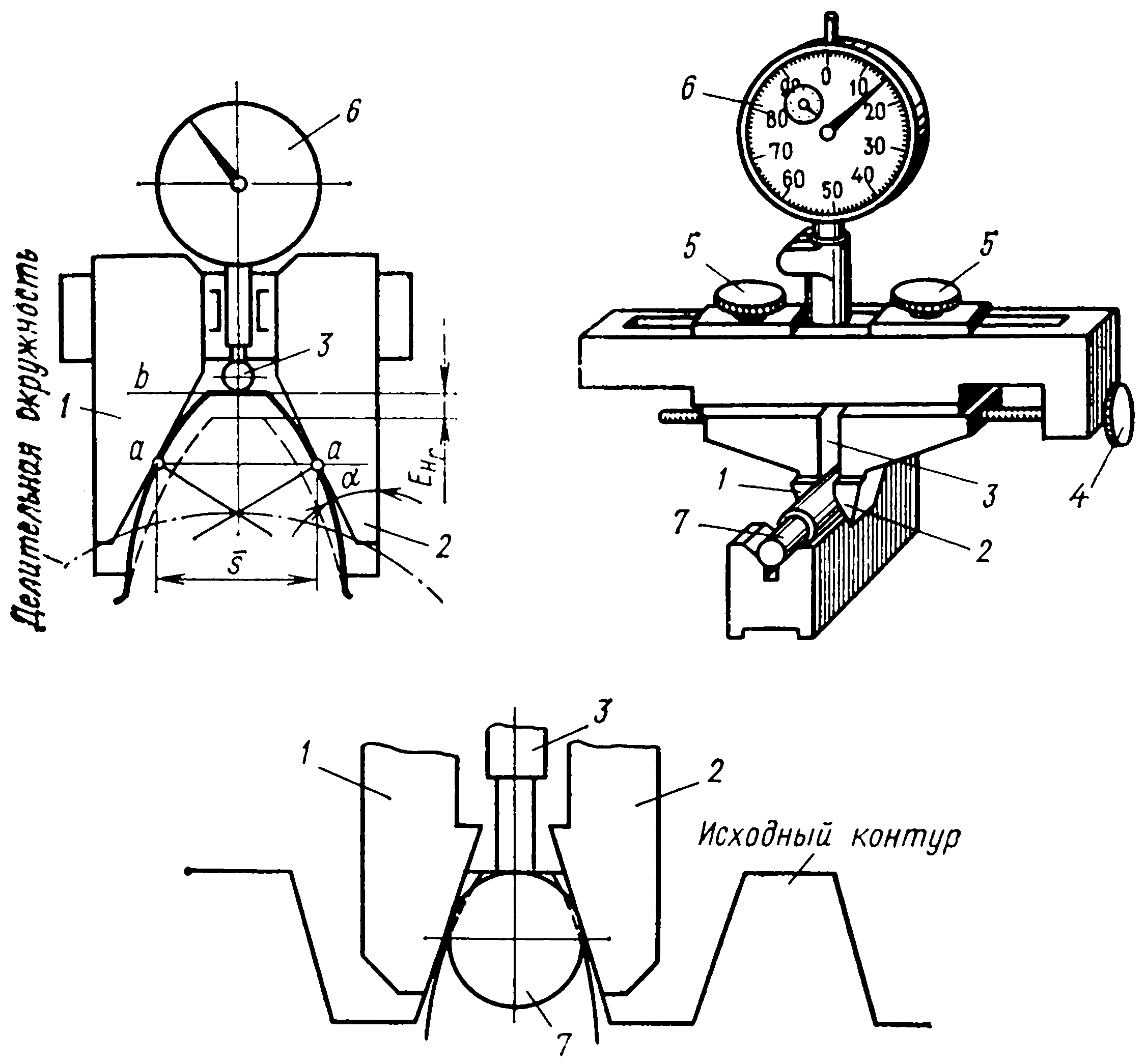 Рисунок 8.1 — Схема контроля тангенциальным зубомером: 1, 2 — измерительные губки; 3 — наконечник; 4, 5 — винты; 6 — индикатор; 7 — ролик.