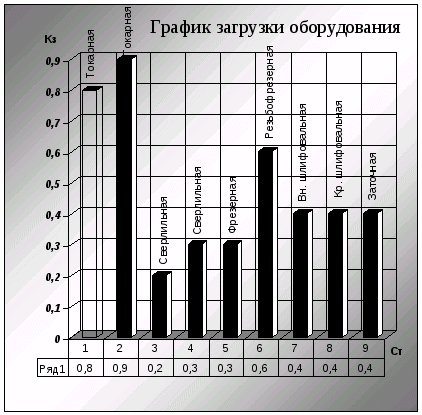 Общая стоимость оборудования – 18 150 000 рублей. Число оборудования составляет 15 единиц, из них 8 токарных станков; 2 сверлильных; 1 фрезерный; 1 резьбофрезерный; 2 шлифовальных станка и 1 заточной. Затраченная мощность – 117,345 кВт. Коэффициент загрузки оборудования равен 0,6.