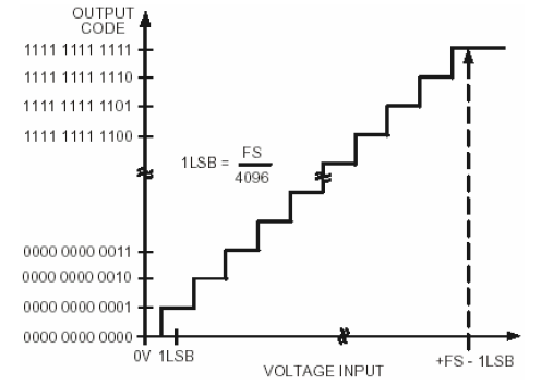 В псевдодифференциальном или однополярном режиме входной сигнал находится в диапазоне 0...VREF. Выходной код в псевдодифференциальном или однополярном режиме – прямой двоичный код, единица младшего разряда (LSB) соответствует 1 LSB = FS/4096 или 2.5 В/4096 = 0.61 мВ = 610 мкВ при опорном напряжении VREF = 2.5 В. В идеале характеристика преобразования проходит через точки 1/2 LSB, 3/2 LSBs, 5/2 LSBs, . . ., FS–3/2 LSB. Идеальная характеристика преобразования показана на рисунке 12.