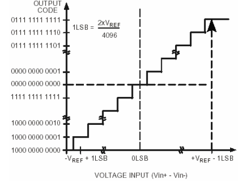 В полностью дифференциальном режиме амплитуда дифференциального сигнала представляет собой разность между величинами сигналов на входах VIN+ и VIN– (то есть VIN+ – VIN–). Максимальный размах дифференциального сигнала таким образом составляет величину от –VREF до + VREF (то есть 2·VREF). Это без учета синфазного сигнала (common mode, CM). Синфазный сигнал является средним двух сигналов, т.е. (VIN+ + VIN–)/2 и таким образом синфазный сигнал – это уровень, относительно которого изменяются два входных сигнала. Поэтому пределы изменения сигнала на каждом входе определяются величиной CM ± VREF/2. Синфазное напряжение устанавливается с помощью внешних цепей и его диапазон зависит от величины VREF. В полностью дифференциальном режиме аналоговый сигнал преобразуется в дополнительный цифровой код с величиной 1 LSB = 2·VREF/4096 или 2·2,5 V/4096 =1,22 мВ при VREF = 2,5 В. В идеале характеристика преобразования проходит через точки 1/2 LSB, 3/2LSBs, 5/2LSBs, ..., FS–3/2 LSB. Идеальная характеристика преобразования показана на рисунке 13.