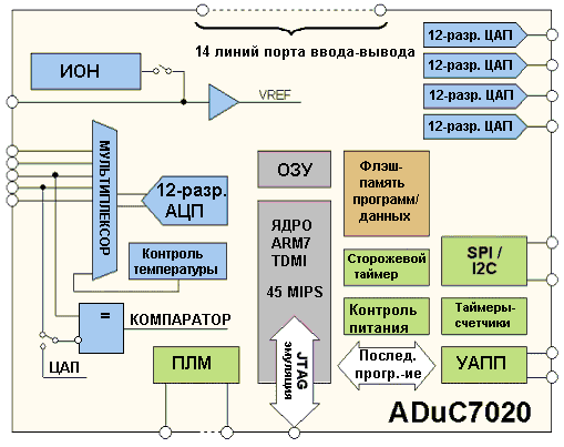 ADuC7020 - микроконтроллер фирмы Analog Devices для прецизионной обработки аналоговых сигналов, содержащий в своем кристалле полнофункциональную 12-разрядную систему сбора и обработки данных на основе ядра микроконтроллера ARM7TDMI и 12-разрядного АЦП с частотой преобразования 1 МГц. По аналогии с другими интегральными преобразователями данных микроконтроллер характеризуется сочетанием на одном кристалле прецизионного аналогово-цифрового и цифро-аналогового преобразования и флэш-микроконтроллера.
