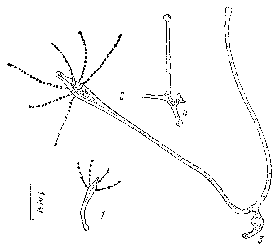 Формирование первичного полипа. Развитие колонии было прослежено со стадии латеральной почки, отделившейся от материнского полипа (рис. 1, 1). Начальные размеры продолговатой грушевидной почки: 0,3—0,4 мм в длину и примерно 0,1 мм в диаметре в самом широком месте.