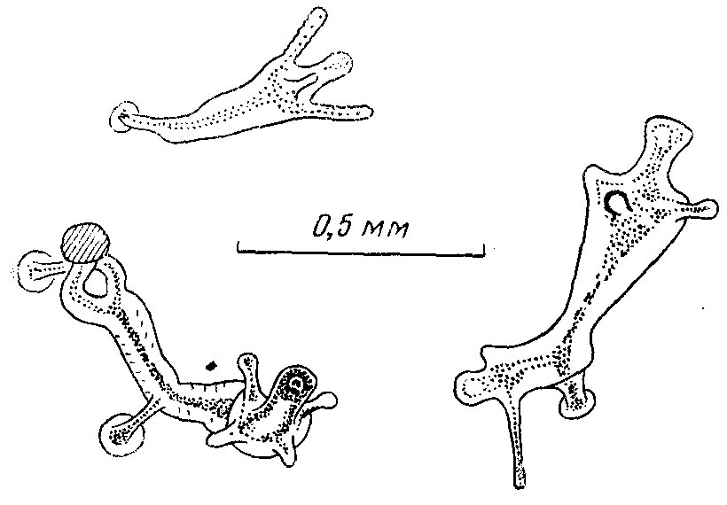 Первые медузоидные почки появляются часто сразу после достижения полипом взрослых размеров, т. е. начиная примерно с 13 сут развития. Начальные размеры этих почек, шаровидных по форме, возникающих среди щупалец, 0,07 мм в диаметре. С самого начала они отличаются от латеральных почек не только своим местоположением, но также цветом (они прозрачны) и формой—у них сразу образуется ножка (рис. 1, 10). По-видимому, пища не может непосредственно поступать в медузоидную почку, так как никогда не приходилось видеть ее желтой или оранжевой, т. е. окрашенной в цвет пищи.