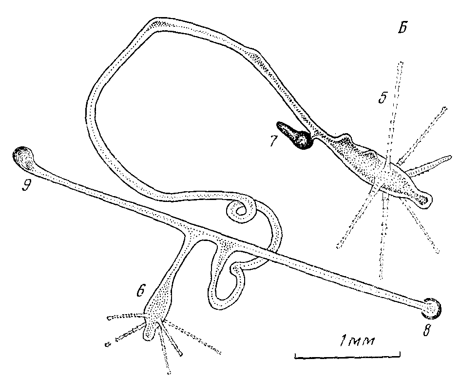 Рис. 2. Образование колонии. А:: 1— гидрант на 3-и сут развития; 2—гидрант на 11-е сут развития; 3—неотделившаяся почка до прикрепления; 4 — то же после прикрепления почки, образования столона и дочернего гидранта на нем на 12-е сут; Б—колония на 24-е сут развития; 5—первичный гидрант;6—второй гидрант; 7—грушевидная латеральная почка, которая может стать третьим гидрантом; 8—прикрепительный диск первого гидранта; 9 — прикрепительный диск второго гидранта