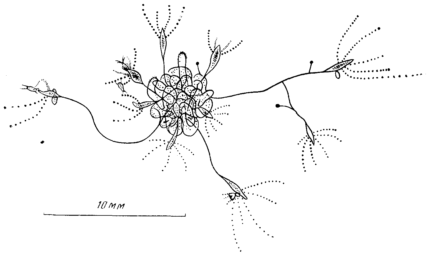 Наблюдения за состоянием гидроида при продолжительном голодании показали, что одиночные полипы небольших размеров (длина ножки в расслабленном состоянии 8 мм, щупалец 7 мм) выживают без пищи в течение более чем 40 сут. В первые дни полипы сильно вытягиваются, но уже к 20-м сут уменьшаются до 1 мм, после чего еще 20 сут остаются почти без изменений. Затем щупальца укорачиваются и рассасываются, хотя миниатюрные остатки полипов (около 0,2 мм) живут еще не менее одного месяца (рис. 5).