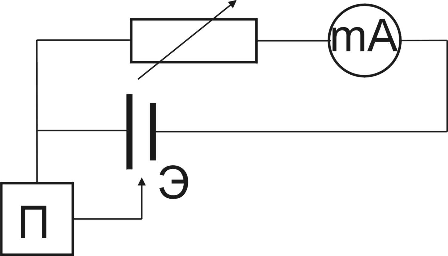 Рис. . Схема электрической цепи с регулируемым сопротивлением , используемой для получения данных для построения поляризационной диаграммы. Где Э – электрод сравнения, mА – миллиамперметр, П – потенциометр.