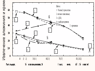 ▪ Для шихт с соотношением Al:Si = 2:3 (~60% кремния в силикоалюминии) извлечение алюминия так же, как и кремния, не зависит от формы углерода в шихте: SiC или С>своб. шихты>. Оксид алюминия восстанавливается по суммарной реакции (2).