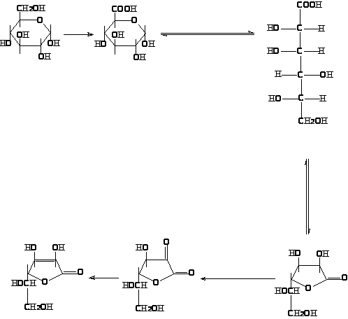 Витамин С, аскорбиновая кислота. Недостаточное ее содержание в пище приводит к возникновению цинги. Участвует в окислительно-восстановительных процессах живой клетки. Связано это с тем, что аскорбиновая кислота существует в двух формах. При окислении аскорбиновая кислота теряет два атома водорода и превращается в дегидроаскорбиновую кислоту, которая, будучи такой же биологически активной, как восстановленная форма, значительно уступает ей по степени устойчивости. Если окисление неглубоко, дегидроформа может быть вновь восстановлена в аскорбиновую кислоту. Сильные окислители вызывают необратимое превращение аскорбиновой кислоты и полное ее разрушение. в растениях, по-видимому, имеется два независимых пути биосинтеза аскорбиновой кислоты. Один начинается с глюкозы (или галактозы) и далее идет через глюкозо- (или галактозо-) фосфат; другой путь в качестве исходных веществ предполагает глюкуроновую (или галактуроновую) кислоту.