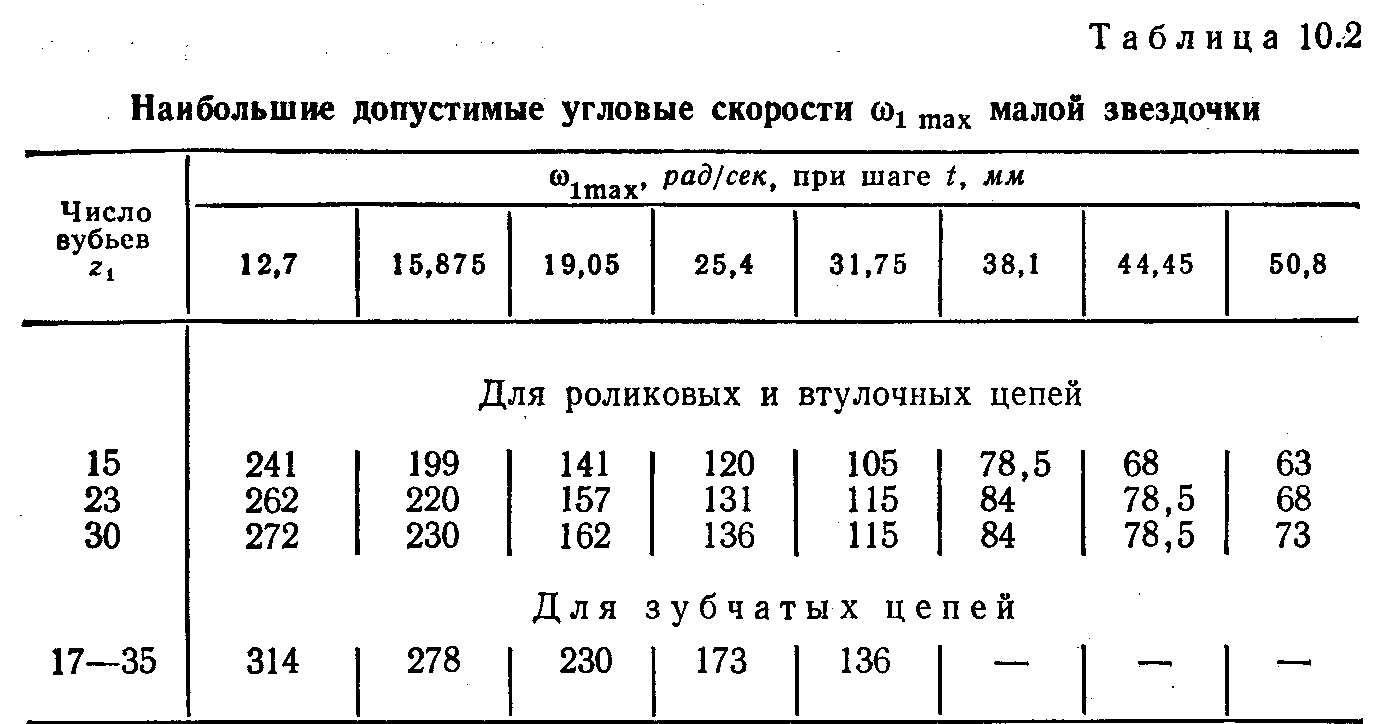 8. Для выбранной цепи с t=38,1 мм по табл. 10.2 /1/ интерполированием определяем ω>1мах>=82,6 рад/сек, следовательно, условие ω>1> < ω>1мах> соблюдается.
