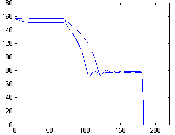 Рисунок 19 – Зависимости ω=f(φ) в процессе замедления до пониженной скорости и точного останова двигателя (модель Matlab 6)