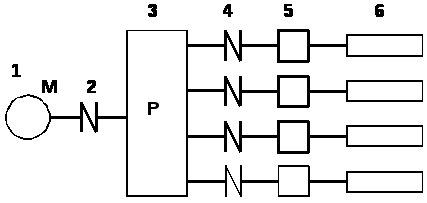 Управление выпрямителя (UZ1) подключается к промышленной сети переменного тока, через автоматический выключатель (QF1) с помощью магнитного пускателя КМ1. Выпрямленные напряжения и ток с выхода преобразователя подаются на двигатель постоянного тока М1. С целью уменьшения пульсации тока и расширение зоны коммутации двигателя в цепь нагрузки включены два сглаживающих дросселей (Lдр). Обмотка возбуждения двигателя управляется с помощью тиристорного преобразователя (UZ2).Необходимый ток возбуждения устанавливается реостатом RP1.