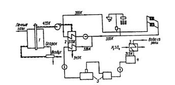 Возможным вариантом использования производственной воды для теплоснабжения является нагревание вентиляционного воздуха, поступающего в производственные помещения. Интересны комбинированные схемы, предусматривающие одновременное использование охлаждающей воды и какого-либо другого вида ВЭР, например использование тепла горячего воздуха из колчеданных печей и тепла охлаждающей воды из сернокислотных холодильников. По этой схеме (рис. 1.7) горячий воздух из валов колчеданных печей 1 с температурой 473 К используют в первой зоне теплообменника 2 для нагрева воды на нужды централизованного теплоснабжения комбината и жилого поселка. Температура горячего воздуха после теплообменников составляет 343 К. Охлаждающую воду из сернокислотных холодильников используют для восполнения утечек из тепловых сетей и покрытия нагрузок горячего водоснабжения поселка и комбината. Воду для охлаждения кислоты подают из реки в холодильники 3, в которых она нагревается до 313 К. Затем отправляют в промежуточный сборный бак 4, откуда насосом перекачивают к водоподготовительной установке 5. После очистки от механических приме сей устранения временной жесткости и деаэрации подпиточную воду подают в теплообменник 2, где она подогревается до 335 К. Подпиточную и обратную воду после смешения подают насосом во вторую зону теплообменника 2, где она подогревается до 355 К и поступает в тепловые сети.