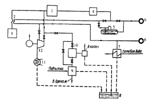 1 — парогенератор; 2— промежуточный пароперегреватель; 3 — производственный агрегат; 4— пароочиститель; 5— тепловой аккумулятор; 6— потребители тепла; 7— теплообменник; 8— бак питательной воды; 9— химводоочистка; 10— питательный насос; 11— конденсатор; 12— турбина двойного давления