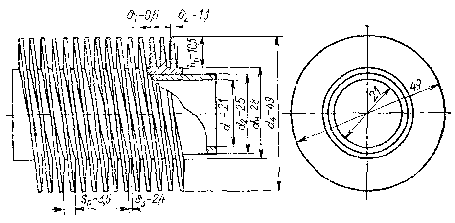 Для холодильника выбираем оребренные биметаллические трубы. Отечественная промышленность выпускает оребренные трубы для воздушных холодильников длиной 4 и 8 м. для дальнейшего расчета принимаем трубы длиной 4 м. материал внутренней трубы – латунь ЛО-70-1. Материал оребрения – алюминиевый сплав АД1М. количество ребер, приходящихся на 1 м трубы, Х=286. Коэффициент оребрения φ=9.