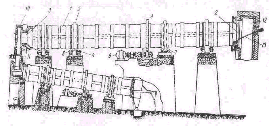1- железный барабан, 2- холодный конец, 3 - горячий конец, 4 - ролики, 5 - бандажи, 6 - подшипники, 7 - приспособление, препятствующее сходу барабана с опор, 8 - двигатель, 9 - венцовая шестерня, 10 - топливная головка. 11 - кольцо с кромкой, 12 - загрузочная коробка, 13 - отбойное приспособление (стальная болванка)