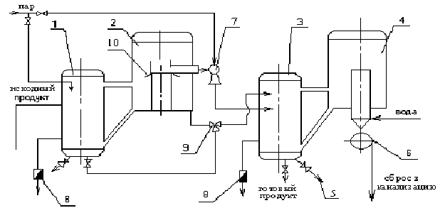 Рисунок 1 – Двухкорпусная вакуум-выпарная установка: 1 – калоризатор 1-ой ступени; 2 – сепаратор 1-ой ступени; 3 – калоризатор 2-ой ступени; 4 – сепаратор 2-ой ступени; 5 – пробоотборный кран; 6 –водокольцевой насос; 7 – инжектор; 8 – конденсатоотводчики; 9 –трехпозиционный кран; 10 – зонт