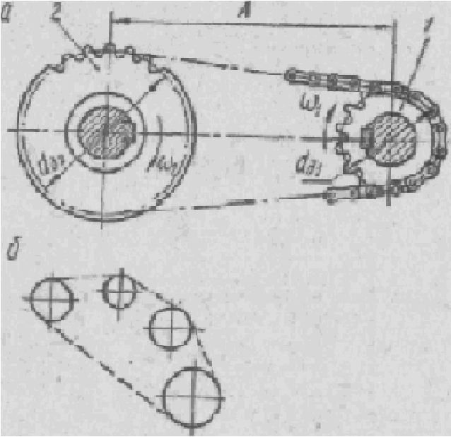В связи с отсутствием проскальзывания в цепных передачах обеспечивается постоянство среднего передаточного числа. Наличие гибкой связи допускает значительные межосевые расстояния между звездочками. Одной цепью можно передавать движение одновременно на несколько звездочек (рис.1, б). По сравнению с ременными цепные передачи имеют при прочих равных условиях меньшие габариты, более высокий КПД и меньшие нагрузки на валы, так как отсутствует необходимость в большом предварительном натяжении тягового органа.