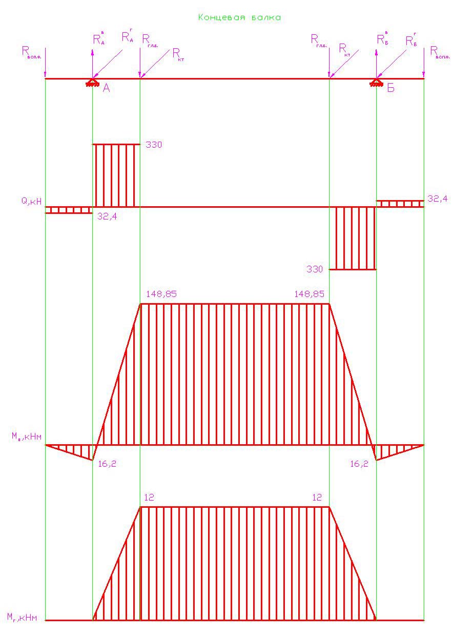 Сечение концевой балки состоит из двух вертикальных и двух горизонтальных листов. Концевая балка нагружена сосредоточенными силами в местах крепления главной балки и вспомогательных ферм, от которых возникают моменты в горизонтальных и вертикальных плоскостях.