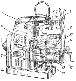 Изменение частоты вращения шпинделя посредством коробки скоростей 4, расположенной внутри станины 2, и величины подачи стола с помощью коробки подач 14, находящейся внутри консоли 11 станка, осуществляется преселективно, т, е. поворотом лимба без прохождения промежуточных ступеней. Стол перемещается в трех взаимно перпендикулярных направлениях с рабочими подачами S>прод>, S>поп>, s>b> и ускоренно. Стол 9 универсального станка может поворачиваться относительно вертикальной оси, что позволяет обрабатывать винтовые канавки сверл, червяков и т. п. Станок покоится на фундаментной плите 1. Стол перемещается в направляющих поворотной плиты 10, расположенной на поперечных салазках 12. Оправка с фрезой поддерживается подвесками 6, перемещаемыми на хоботе 7 станка.