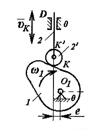 Трехзвенный кулачковый механизм состоит из стойки 0, кулачка 1, толкателя 2, ролика 2’ (см. рисунок 4). Кулачок совершает равномерное вращательное движение с угловой скоростью ω>к>, толкатель совершает прямолинейное возвратно-поступательное движение со скоростью v>А.>