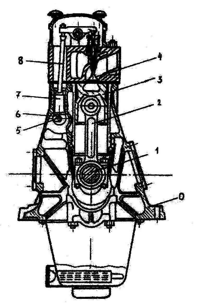 КПМ состоит из кривошипа (коленчатого вала) 1, шатуна 2, ползуна (поршня) 3 и стойки (корпуса) 0. Силой, вызывающей движение поршня является сила давления расширяющихся газов. Механизм газораспределения обеспечивает наполнение рабочих цилиндров свежим зарядом и очистку их от отработанных газов. Основными элементами механизма газораспределения являются впускные и выпускные клапаны 4 и распределительные валы 5 с кулачками 6. Движение к клапану передается через толкатель 7, штангу 8 и коромысло 9. Кулачок взаимодействует с толкателем по средствам ролика, установленного в нижней части толкателя. Движение к распределительному валу 5 от кривошипа 1 может передаваться цепной передачей или набором цилиндрических зубчатых колес.