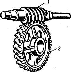 Червячной передачей называется механизм, служащий для преобразования вращательного движения между валами со скрещивающимися осями. Обычно червячная передача (рис.1) состоит из червяка 1 и сопряженного с ним червячного колеса 2. Угол скрещивания осей обычно равен 90°; неортогональные передачи встречаются редко. Червячные передачи относятся к передачам зацеплением, в которых движение осуществляется по принципу винтовой пары. Червячную передачу можно получить из рассмотренной ранее винтовой зубчатой передачи, если уменьшить число зубьев одного из косозубых колес до z>1>= 1...4 и увеличить их угол наклона к оси, превратив таким образом косозубое колесо в винт (червяк). Поэтому червячные передачи относят к категории зубчато-винтовых.