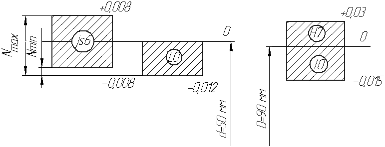 2.5 По ГОСТ 520 – 89 и ГОСТ 25347 – 82 определяем отклонения ES, EI, ei, es, строим поля допусков по наружному (D) и внутреннему (d) диаметрам и определяем табличные натяги N>max> и N>min>