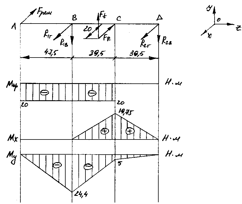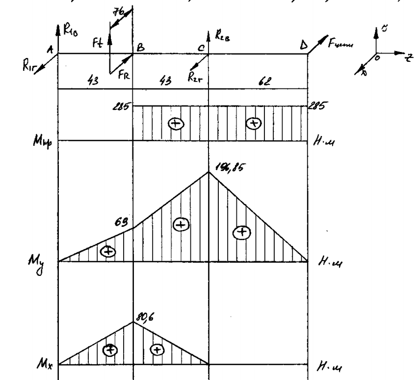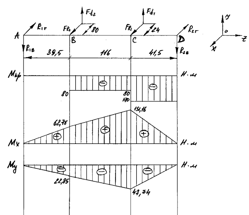 Из построенных эпюр видно, что опасными являются сечении В и С.