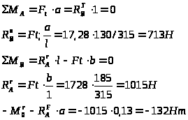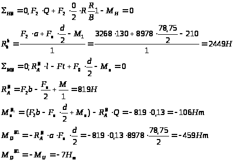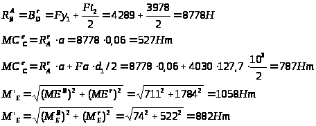 M>C>Hr=-Ft(c+a)+R>A>r∙a+Fa>1>∙d/2=-18000∙0,245+13711∙0,085+4030∙500,16∙10-3/2=-2237Hm