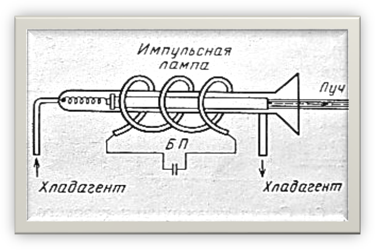 Рабочим веществом другого вида твердотельного лазера является стекло (с примесью активного вещества – ионов неодима) или кристалл, например, рубина (активное вещество – ионы хрома), источником подкачки - ксеноновая импульсная лампа, а резонансной системой – рабочее вещество в виде стержня, торцы которого отполированы и представляют собой зеркала. Один торец покрыт плотным не прозрачным слоем серебра, а другой, также посеребренный, имеет коэффициент пропускания порядка 8% рисунок 1.1.