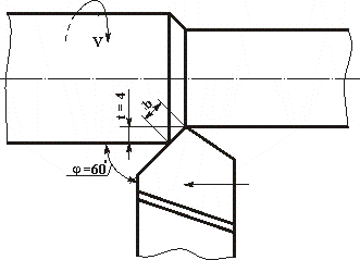 Активною частиною різальної кромки різця при зовнішньому точінні деталі буде ширина зрізуваного шару b, яка визначається за формулою: