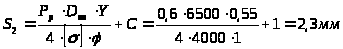 Товщина стінки відпрацьованого конічного дна стінки, завантаженого внутрішнім тиском, приймається більшою з трьох величин S>1>, S>2> або S>3> (S>2> – розрахункова товщина дна в зоні перехода конічної частини в циліндричну; S>3> – розрахункова товщина конічної частини).