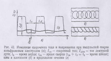 В последние годы для сварки тонколистового металла находит применение импульсная дуга. Основной метал л расплавляется дугой, горящей периодически отдельными импульсами постоянного тока с определенными интервалами во времени. При большом перерыве в горении дуги дуговой промежуток деионизируется, что приводит к затруднению в повторном возбуждении дуги. Для устранения этого недостатка постоянно поддерживается вторая, обычно маломощная дежурная дуга от самостоятельного источника питания. На эту дугу и накладывается основная импульсная дуга. Дежурная дуга, постоянно поддерживая термоэлектронную эмиссию с электрода, обеспечивает стабильное возникновение основной сварочной дуги.