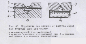 При сварке многопроходных швов с V - или Х-образной разделкой кромок первый проход часто выполняют вручную или механизированно без присадочного металла на весу. Разделку заполняют при последующих проходах с присадочным металлом. Для формирования корпя шва можно использовать медные или стальные съемные подкладки, флюсовую подушку. В некоторых случаях возможно применение и остающихся подкладок. При сварке активных металлов необходимо не только получить хороший провар в корне шва, по и обеспечить защиту от воздуха с обратной стороны расплавленного и нагретого металлов. Это достигается использованием медных или других подкладок с канавками, в которые подается защитный инертный газ. Эта же цель в некоторых случаях достигается при использовании флюсовых подушек.