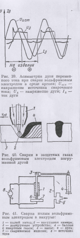 В соответствии с различным напряжением дуги в разные полупериоды переменного тока различна и величина сварочного тока, т.е. в сварочной цепи появляется постоянная составляющая тока. В данном случае мы имеем дело с выпрямляющим (вентильным) эффектом рассматриваемого типа дуги, вызванным различием теплофизических свойств электрода и изделия. Величина постоянной составляющей зависит от величины сварочного тона, скорости сварки, свариваемого металла и т.д. Ее наличие ухудшает качество сварных швов на алюминиевых сплавах и снижает стойкость вольфрамового электрода. Для уменьшения величины постоянной составляющей тока применяют различные способы (см. гл. IV).