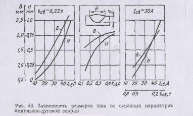 Шов в этом случае состоит из отдельных перекрывающих друг друга точек. Величина перекрытия зависит от металла и его толщины, силы сварочного тока и тока дежурной дуги, скорости сварки и т.д. С увеличением силы тока и длительности его импульса ширина шва и глубина проплавления увеличиваются. Размеры шва в большей степени зависят от силы тока, чем от длительности его импульса. Благоприятная форма отдельных точек, близкая к кругу, уменьшает возможность вытекания расплавленного металла из сварочной ванны (прожога). Поэтому сварку легко выполнять па весу без подкладок при хорошем качестве, но всех пространственных положениях.