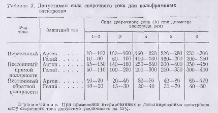 При применении вольфрамового электрода в качестве защитных используют инертные газы или их смеси и постоянный или переменный ток. Лучшие результаты при сварке большинства металлов дает применение электродов не из чистого вольфрама, а торированных, иттрированных или латтанированных. Добавка в вольфрам при изготовлении электродов 1,5-2% окислов иттрия и лантана повышает их стойкость и допускает применение повышенных на 15% сварочных токов. Перед сваркой рабочий конец электрода обычно затачивают на конус с углом 60° на длине двух-трех диаметров. Форма заточки электрода влияет на форму и размеры шва. С уменьшением угла заточки и диаметра притупления в некоторых пределах глубина проплавления возрастает.