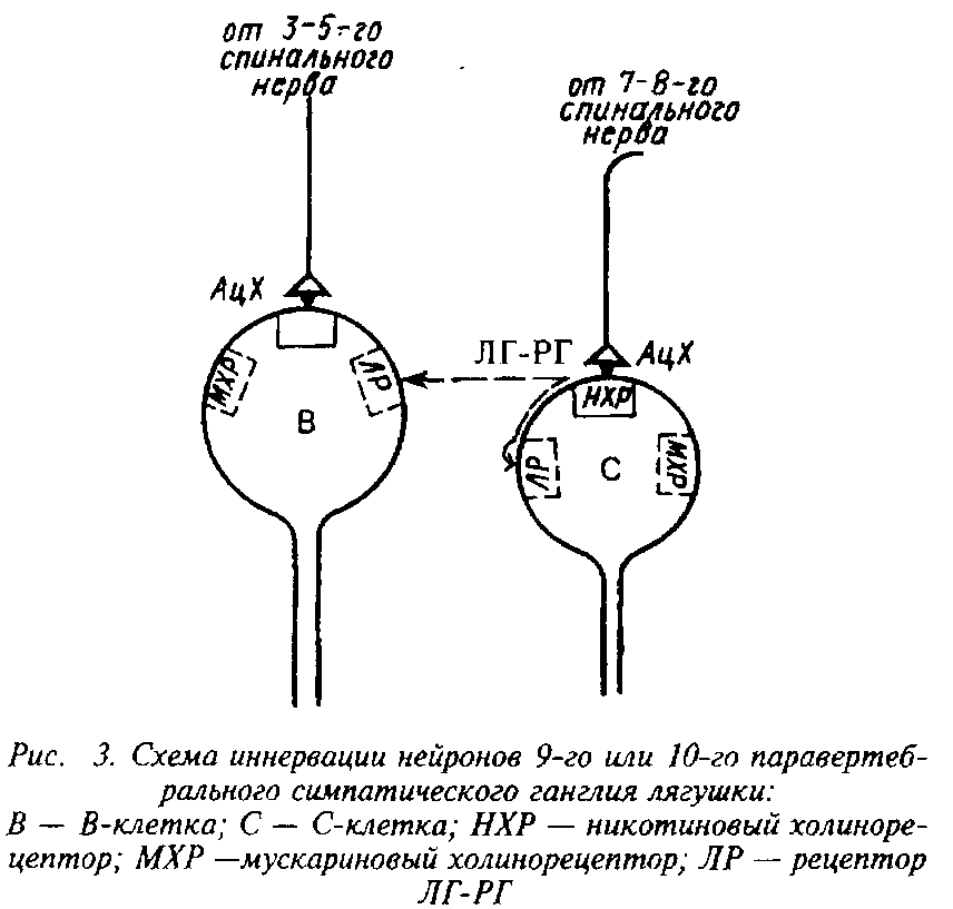 Эта ситуация представляет собой интересный случай сосуществования двух нейромедиаторов – классического и пептидного. Взаимоотношения между этими двумя нейромедиато-рами поясняет схема. В 9–10 м паравертебральном симпатическом ганглии существуют два вида нейронов: В-клет-ки, которые снабжаются волокнами 3–5 го спинальных нервов, и С-клетки, которые иннервируются волокнами 7–8 го спинальных нервов. Электрическое раздражение 3–5 го нервов вызывает холинергические быстрые ВПСП только в В-клет-ках. При раздражении 7–8 го нервов возникают холинергические быстрые ВПСП только в С-клетках и поздние медленные ВПСП как в С-клетках, так и в В-клетках, причем в В-клетках поздние медленные ВПСП появляются примерно на 15 мс позднее, чем в С-клетках. После перерезки 3–5 го нервов холинергические потенциалы в В-клетках исчезают, тогда как раздражение 7–8 го нервов продолжало вызывать в В-клетках поздние медленные ВПСП. Очевидно, ЛГ-РГ высвобождается совместно с АХ из пресинаптических окончаний на С-клетке, а затем диффундирует на расстояние порядка 50 мк к В-клетке, которая не имеет синаптического контакта с С-клеткой.