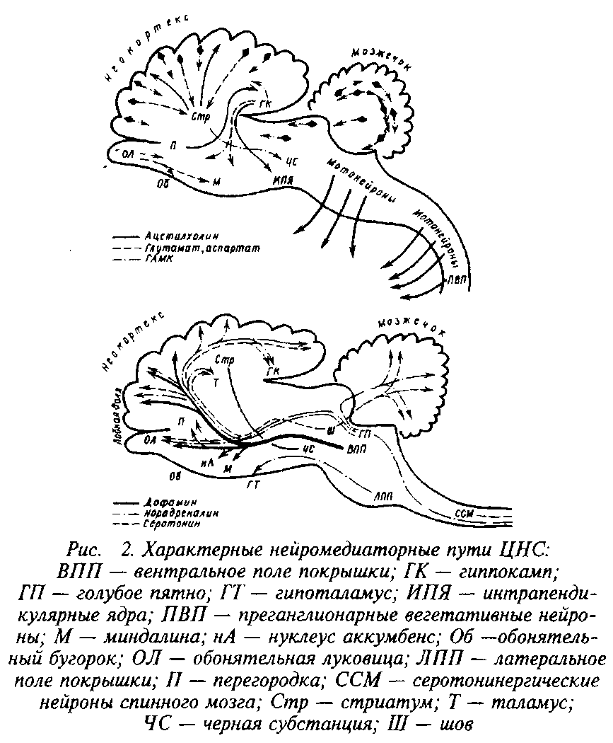 Общая схема рапределения нейромедиаторных связей по структурам представлена на рис. 2. Как видно из схемы, пока имеется недостаточно фактов, чтобы представить полную картину химического картирования мозга. Это требует дальнейшей большой совместной работы морфологов и нейрохимиков. Однако для ряда путей, особенно функционирующих на основе биогенных аминов, эти данные уже получены. Они локализованы преимущественно в нейронах, входящих в состав полосатого тела, вентролатерального ядра, черного вещества и голубого пятна. Аксоны этих нейронов проецируются, как правило, в гипоталамус, мозжечок, передний мозг.