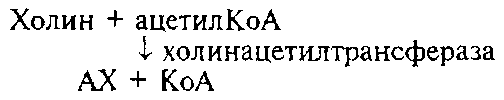 Предшественником АХ. служит холин, потребляемый с пищей. Холин поступает в холинергические нейроны с помощью специфической системы транспорта. Синтез АХ происходит в цитоплазме с участием холинацетилтрансферазы: