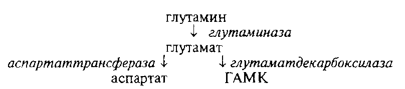 Глутамин поступает в организм с пищей. В нейроны он поступает из глии и служит предшественником для синтеза глута-мата, аспартата и ГАМК: