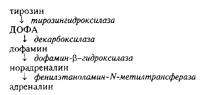 Предшественником катехоламинов является L тирозин, который организм получает в составе пищи, а также может синтезировать в печени из фенилаланина, потребляемого с пищей. L тирозин поступает в нервное окончание посредством активного транспорта. Ниже приведена схема синтеза катехоламинов: