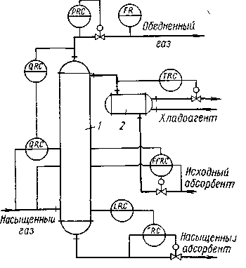Рис VII-19 Схема многоконтурного (каскадно-комбинированного) регулирования процесса абсорбции: 1 - абсорбер; 2 - холодильник.