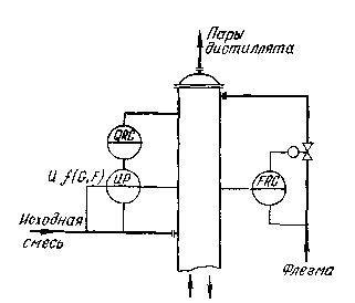 Согласно правилу фаз при разделении бинарной смеси, если; давление в колонне постоянно, состав дистиллята и температура однозначно связаны между собой. Поэтому для управления; подачей флегмы применяют регулятор температуры верхней части колонны.