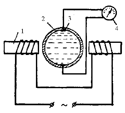 Схема индукционного расходометра. 1 - магнитопровод; 2 - трубопровод; 3 - электроды; 4 - измерительный прибор.